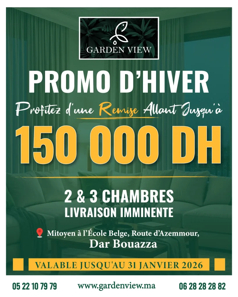 Garden View est une résidence fermée et sécurisée accessible uniquement aux habitants. Sa conception architecturale a été réalisée dans un souci de minimiser les vis-à-vis et d’offrir des vues dégagées, La totalité des appartements jouissent de terrasses couvertes généreuses, de vrais espaces de vie. La circulation des véhicules a été minimisée au sein de la résidence. Les façades d’immeubles profiteront d’une attention particulière, afin d’apporter une identité propre au projet GARDEN VIEW, en totale harmonie avec son environnement.