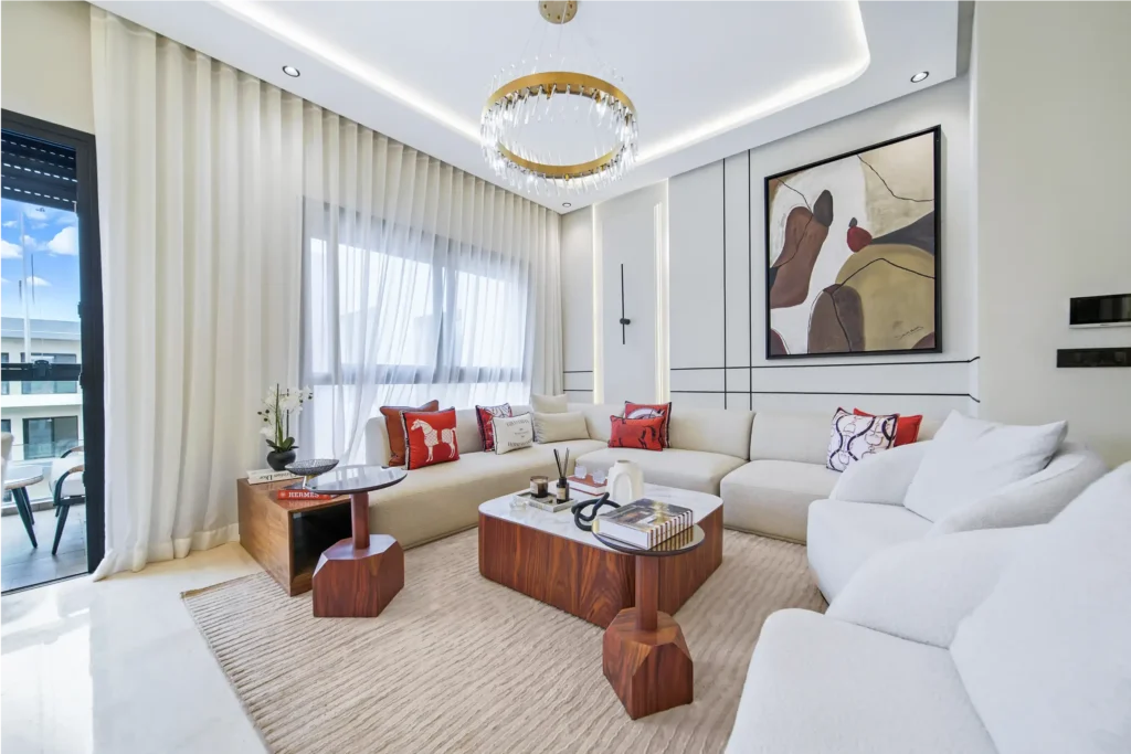 La spacieuse salle de séjour est baignée de lumière naturelle grâce aux grandes fenêtres offrant une vue panoramique sur la ville.