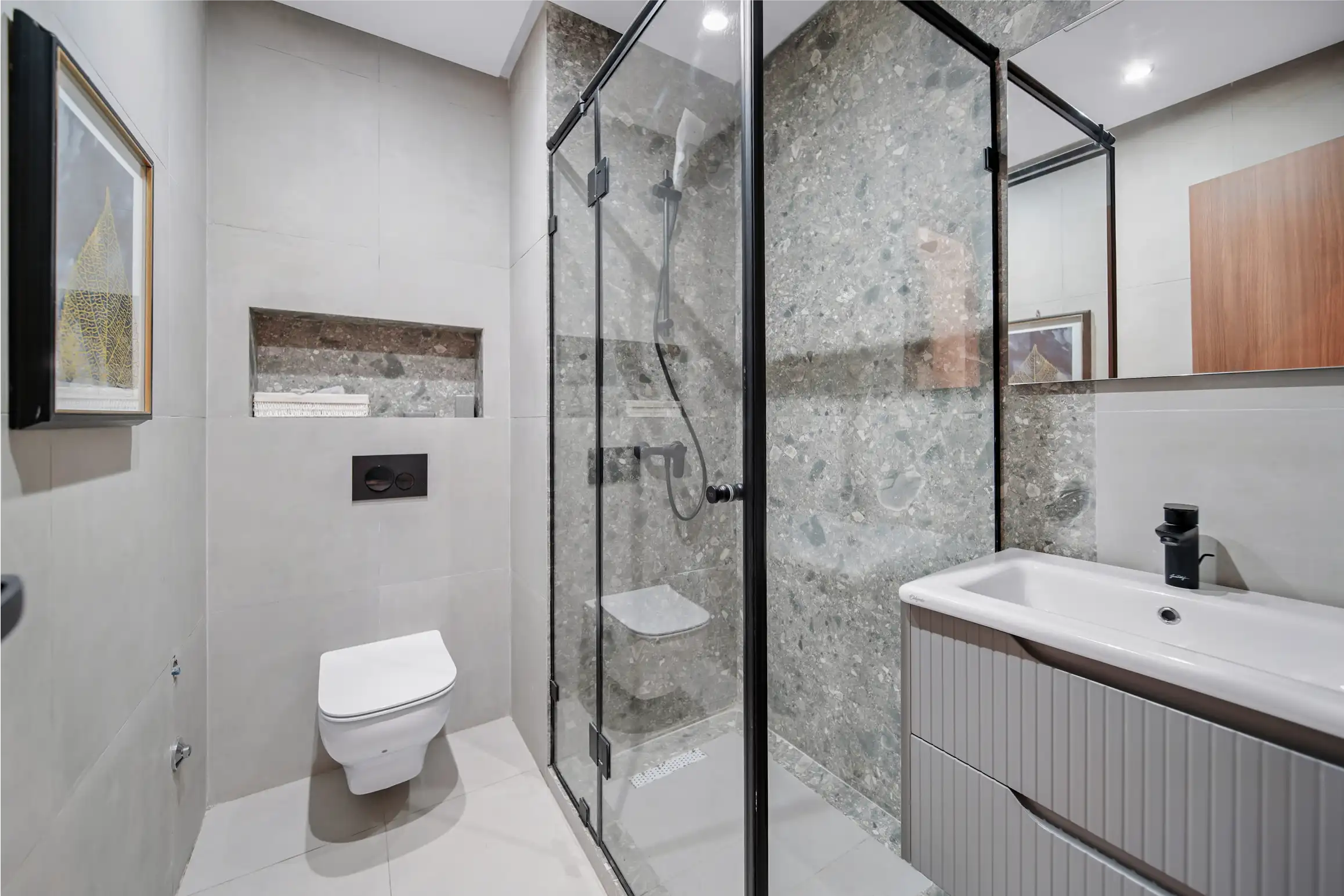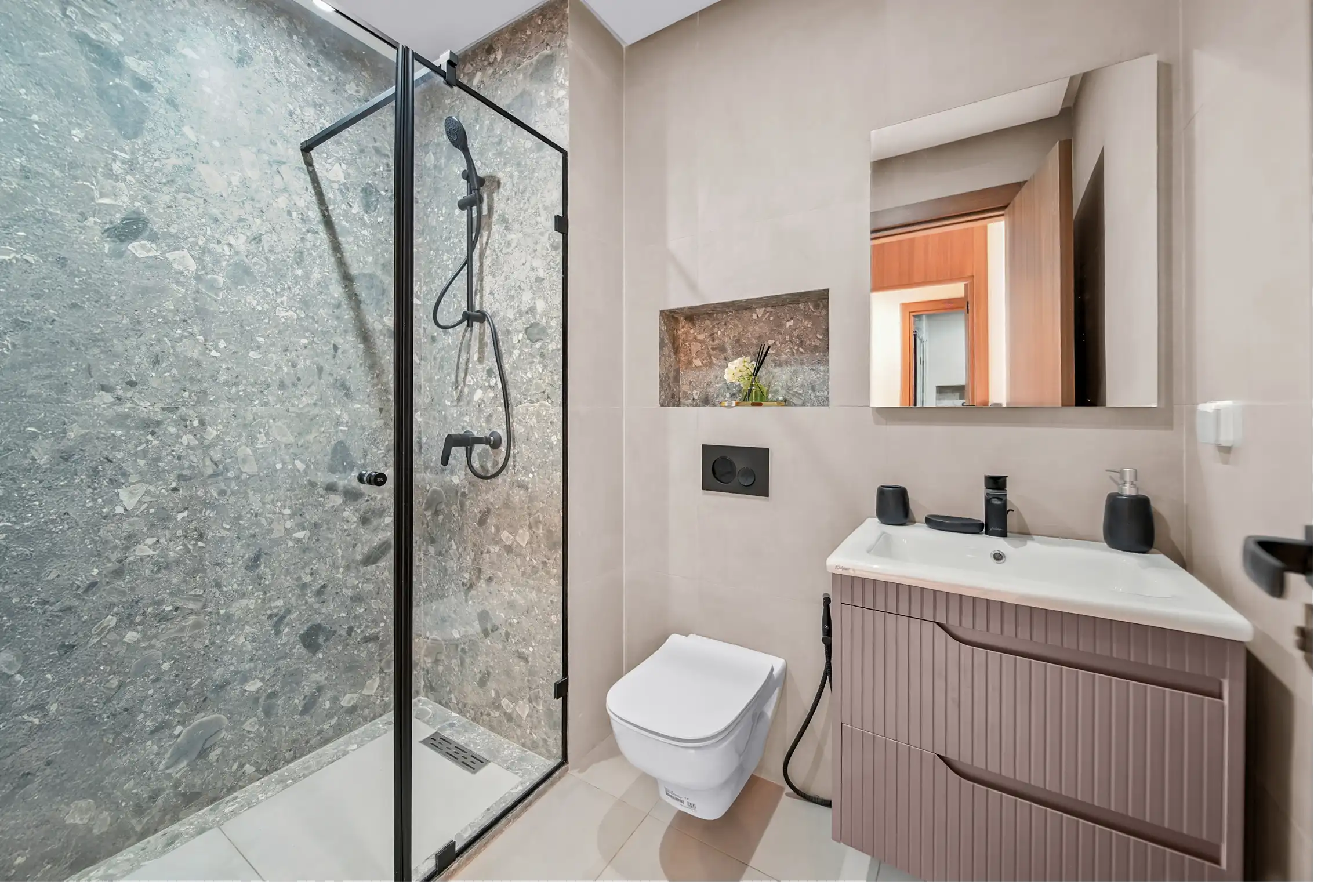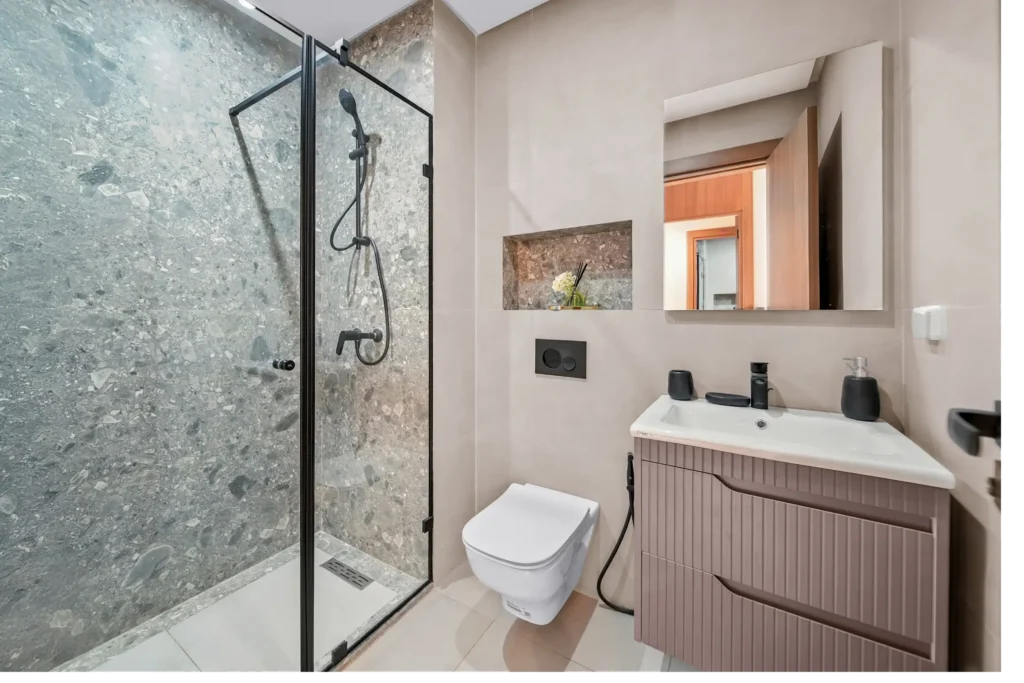 La salle de bain de cet appartement de haute standing incarne le summum du luxe et du bien-être. Conçue avec des matériaux de haute qualité
